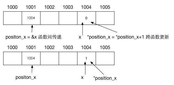 解决方法,传递指针,用指针告诉go_forward()函数参数x的值的地址,go_forward()函数就能修改对应地址中的内容。所以用指针的主要原因是让函数共享存储器,一个函数可以修改另一个函数创建的数据,只要提供数据在内存中的地址,修改代码如下。