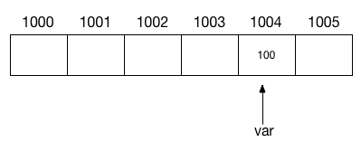 1. 声明变量:C语言声明一个变量时,编译器在内存中留出一个唯一的地址单元来存储变量,如下图,变量var初始化为100,编译器将地址为1004的内存单元留给变量,并将地址1004和该变量的名称关联起来。![]()