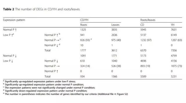 研究者检测低磷和正常磷处理下,相同材料组织的差异基因。发现,不管是在根中还是叶中,低磷耐受大豆材料(CD)的差异基因远多于低磷敏感大豆材料(YH),表明CD材料可以调节一系列基因响应低磷胁迫。