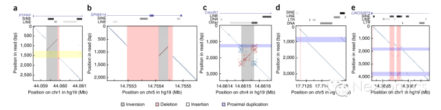 如图2所示,PacBio的超长读取数据可以直接覆盖一些比较复杂的结构变异区域,包括“倒置伴随插入”、“倒置伴随缺失”、“倒置伴随复制”等复杂结构变异。研究中使用的检出流程主要为PacBio开发的PBHoney。