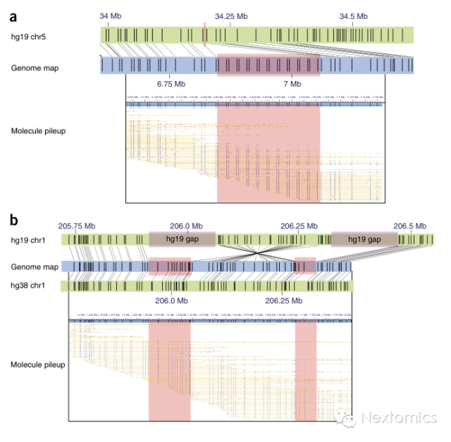 数百kb-数Mb的BioNano的光学图谱数据可以直接检出存在于NA12787基因组上数百kb的大型结构变异,图3中展示了利用BioNano数据发现的一段206.6kb的插入突变与一段577.3kb的一段导致突变。