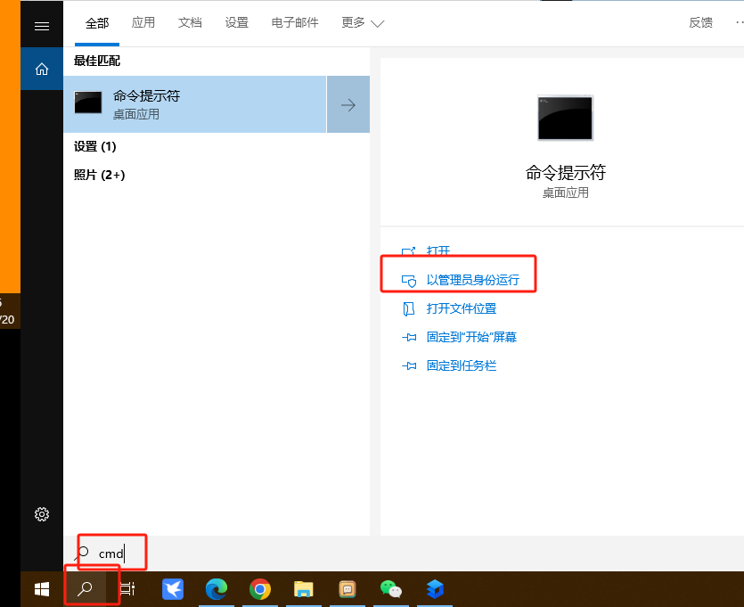 打开命令提示符(开始菜单输入cmd然后以管理员身份运行)