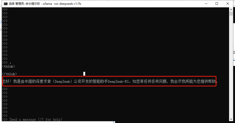 输入命令 ollama run deepseek-r1:1.5b回车(1.5B参数版,普通电脑首选)