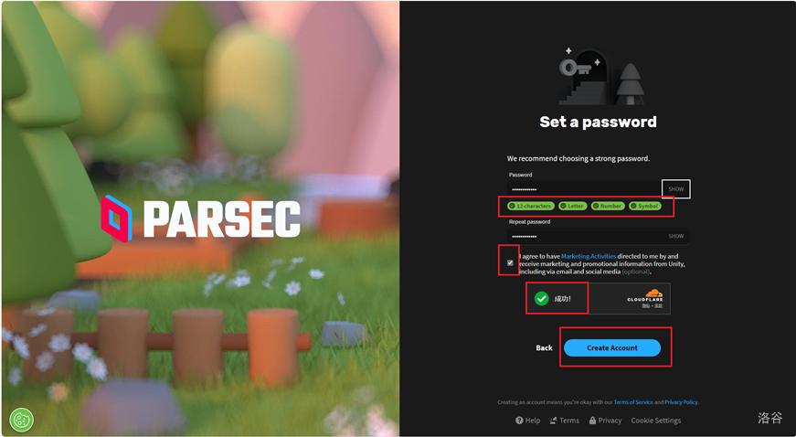 - 设置密码,注意有四个要求(从左到右依次是:大于等于12个字符,有字母,有数字,有特殊符号),下面再次输入一次来确认密码(一定要牢记自己的密码),勾选条款,认证成功后点击创建账号