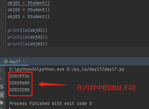 # 在程序中先定义类,才能产生对象 # 定义类的语法结构 class 类名: #类名的首字母最好用大写 数据1 #缩进的代码块表示类的对象的相同数据和功能 def 功能1(self): #类中的函数称为功能/方法 pass eg: class Student: name = '' age = 18 def chooseCourse(self): print('我要选择的课程') 可以通过类名加括号的形式调用类产生对象,即实例化 #每次类的实例化都会产生一个新的对象 obj01 = Student() obj02 = Student() obj03 = Student() #上述是三个不同的对象,调用id()方法的返回值不同