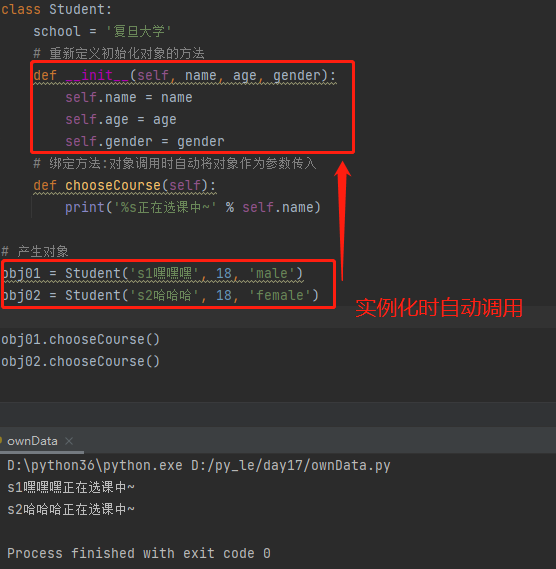 返回该对象'独有'的元素 3.对象调用类中定义的方法时会自动将'对象本身'当做第一个位置参数传入 4.形参self指代当前对象