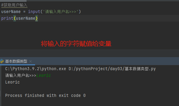 获取用户输入的数据,可赋值给变量名 input('提示信息') userName = input('请输入用户名>>>')