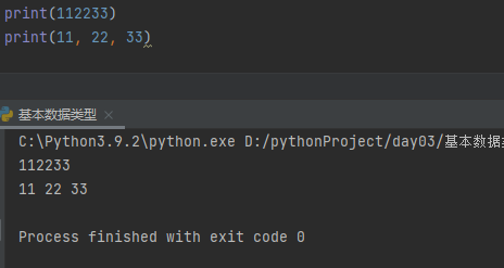 以字符串的形式将括号内一个或多个值打印至控制台 print(112233) print(11,22,33)