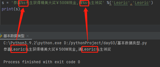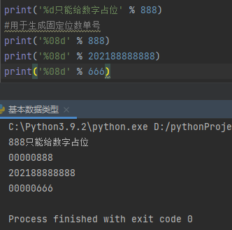 # 占位符 %s 在字符串中提前占位置,给对应数据填充 格式: 字%s符%s串 %(数据1,数据2) # %s的数量与后面数据一一对应,数量系统 小练习: res = """ ------------ info of %s ----------- Name : %s Age : %s gender : %s Job : %s ------------- end ----------------- """ username = input("请输入您的用户名>>>:") age = input('请输入您的年龄>>>:') gender = input('请输入您的性别>>>:') job = input('请输入您的工作岗位>>>:') print(res % (username, username, age, gender, job)) # 占位符 %d 只能给数字占位 %和d之间可以加数字 eg: #%08d:表示输出8位数字不够用0填充 print('%d只能给数字占位' % 888) '''用于生成固定位数单号''' print('%08d' % 888) print('%08d' % 202188888888) print('%08d' % 666)