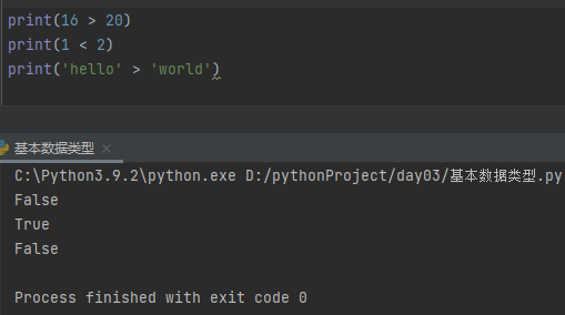 > 大于 < 小于 print(1 > 2) print('hello' > 'world') """字符串比较的时候是按照首字母对应的数字比较""" 对应的ASCII码 A-Z 65-90 a-z 97-122