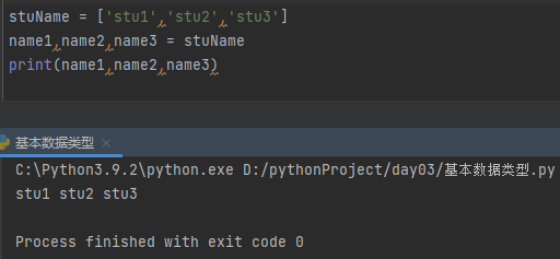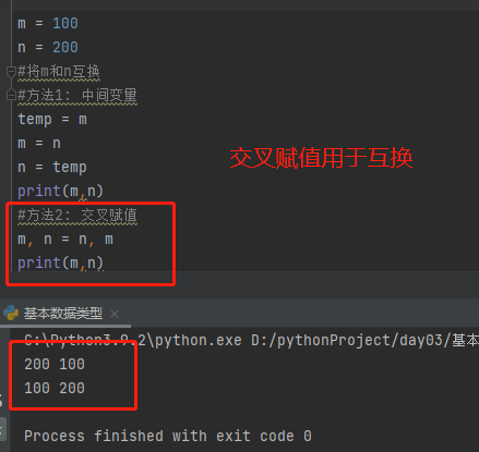 # 增量赋值 x = 16 x += 10 # 等价于 x = x + 10 x -= 20 # 等价于 x = x - 20 x *= 30 # 等价于 x = x * 30 x /= 40 # 等价于 x = x /40 # 链式赋值 x = 'Leoric' y = x z = x '''简化''' x = y = z # 交叉赋值 m = 100 n = 200 将m和n互换 方法1: 中间变量 temp = m m = n n = temp print(m,n) 方法2: 交叉赋值 m, n = n, m print(m,n) # 解压赋值 将列表每个元素赋值给不同的变量 '''默认赋值符左右两边保持相同个数''' stuName = ['stu1','stu2','stu3'] name1,name2,name3 = stuName print(name1,name2,name3) #用*可打破位数限制 list1 = [1,2,3,4,5,6] n1,n2,*_n3,n4 = list1 print(n1,n2,n4,n3)