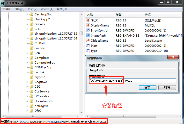 # 如果启动服务时出现错误 发生系统错误2 系统找不到指定的文件 解决办法: 1、按 windows+r打开运行,输入regedit,打开注册表编辑器; 2、在注册表中找到:HKEY_LOCAL_MACHINE\SYSTEM\CurrentControlSet\services-mysql\ImagePath; 3、千万要改成你安装的路径,比如"D:\mysql56\bin\mysqld" mysql。