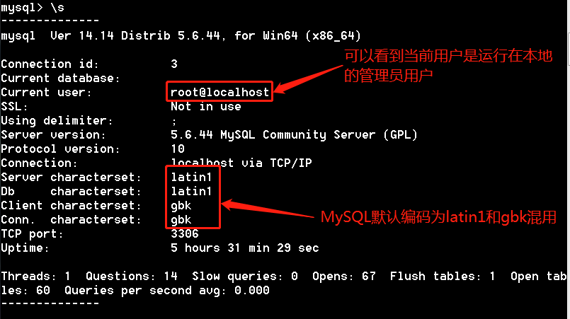 \s 可以查看当前MySQL服务端的基本信息 # MySQL内部字符编码默认不统一