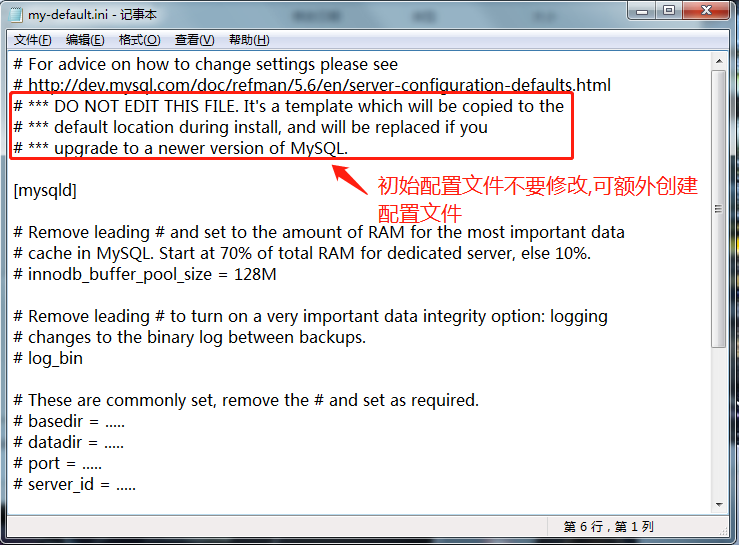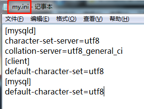 修改字符编码等"出厂设置"需要用到配置文件 1.初始配置文件最好不要修改 my-default.ini 2.想要修改配置需重新创建一个配置文件 3.命名为my.ini """额外的配置文件必须命名my.ini 否则MySQL不读取其中配置""" 4.输入以下配置信息即可修改本地的MySQL使用UTF-8作为统一的字符编码 [mysqld] character-set-server=utf8 collation-server=utf8_general_ci [client] default-character-set=utf8 [mysql] default-character-set=utf8 5.重启服务端