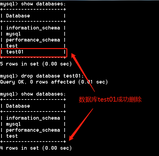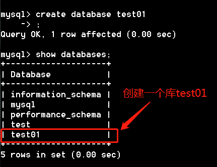 # 查找 1.查看所有数据库名称 show databases; 2.查看指定的数据库 # 一般很少用,了解即可 show create database test01;