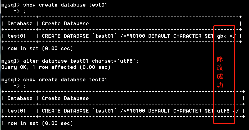 # 修改 1.修改指定数据库编码 alter database test01 charset='gbk'; show create database test01; alter database test01 charset='utf8'; show create database test01; #查看修改之后的编码
