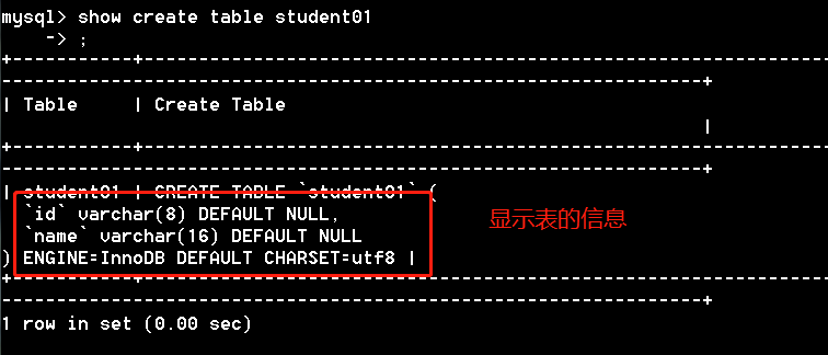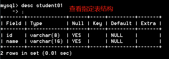 # 查找 1.查看某个库下所有的表名 show tables; 2.查看指定的表的信息 show create table student01 3.查看表结构 # 常用 describe student01 简写: desc student01