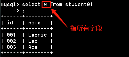 # 查找记录 1.查看student01表中所有数据 select * from student01; 2.查看指定字段对应的数据 select name from student01;