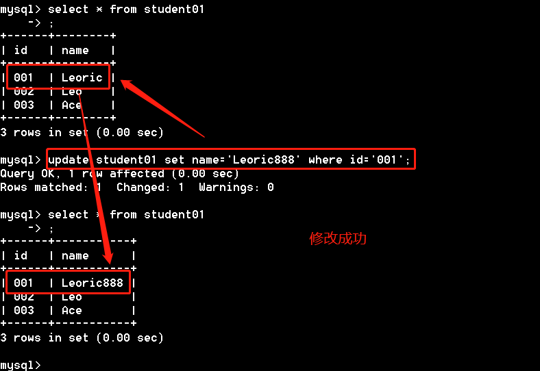 # 修改记录 1.修改符合条件的记录 eg:将id='001'的那条记录的name字段的值改为'Leorci888' update student01 set name='Leoric888' where id='001';