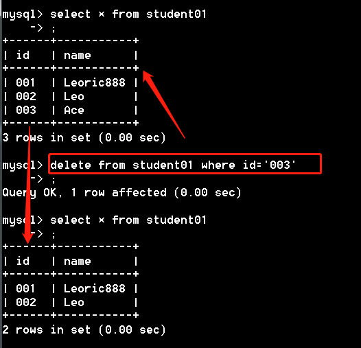 # 删除记录 1.删除符合条件的记录 delete from student01 where id='003'; 2.删除表中所有数据(慎用) delete from student01;
