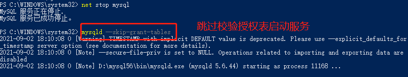 1.以管理员身份停止当前MySQL服务 net stop mysql 2.以取消校验授权表的形式启动服务端 # 该命令启动跳过密码比对,存在安全隐患 mysqld --skip-grant-tables 3.以管理员身份直接登录 mysql -uroot -p 4.修改指定用户密码 # 修改用户数据表中管理员用户对应的密码 update mysql.user set password=password('123456') where user="root" and host="localhost" 5.停止跳过校验授权表的MySQL服务并正常启动 #强制中断 ctrl+c #手动停止服务 net stop mysql net start mysql