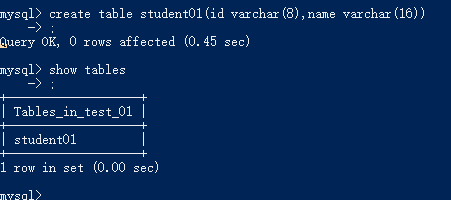 # 增加 1.创建表 create table student01(id varchar(8),name varchar(16));