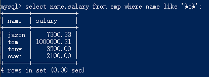 select name,salary from emp where name like '____'; 也可使用函数,两种写法结果相同 select name,salary from emp where char_length(name)=4;