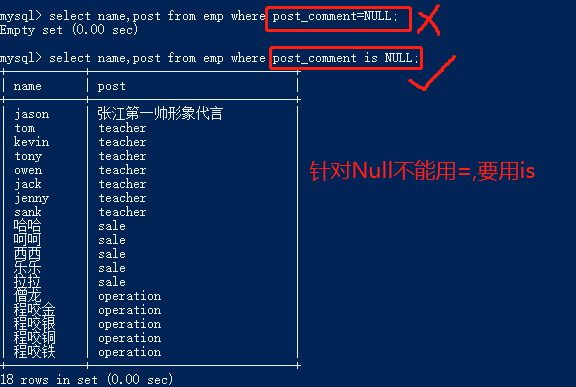 select name,post from emp where post_comment=NULL; 查询结果为空 # 判断是否为空时要用is关键字,不能用等号连接NULL select name,post from emp where post_comment is NULL;