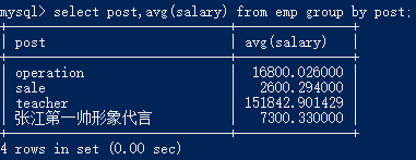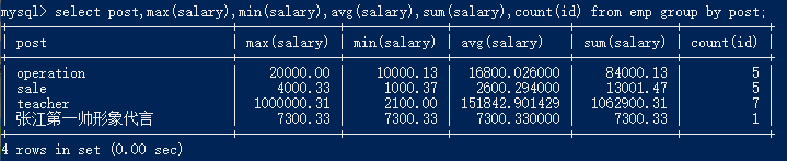 用于分组之后的数据处理 1. max 最大值 2. min 最小值 3. avg 平均值 4. sum 求和 5. count 计数 如果需要获取每个部门的最高薪资、最低薪资、平均薪资、薪资综合、员工人数,就要用到聚合函数 select post,max(salary),min(salary),avg(salary), sum(salary),count(id) from emp group by post;