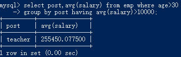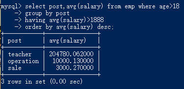 select post,avg(salary) from emp where age>18 group by post having avg(salary)>1888 order by avg(salary) desc;