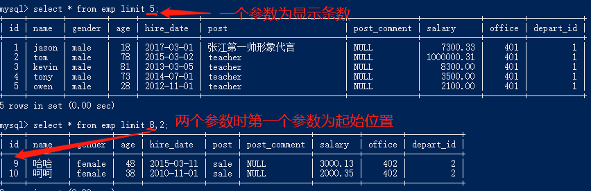 limit 参数1; 参数表示条数 limit 参数1,参数2; 第一个参数表示起始位置,第二个参数表示条数 查询最高的记录详情简便办法:可以按该列排序,再使用limit取第一条记录 select * from emp limit 5; 显示5条 select * from emp limit 8,2; 跳过8条开始,显示2条