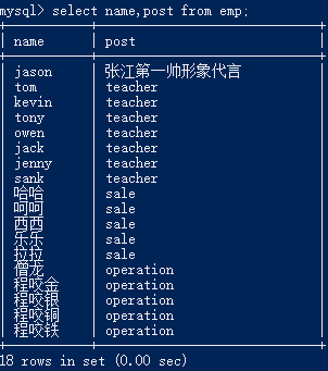 # 测试数据 create table emp( id int primary key auto_increment, name varchar(20) not null, gender enum('male','female') not null default 'male', age int(3) unsigned not null default 28, hire_date date not null, post varchar(50), post_comment varchar(100), salary double(15,2), office int, depart_id int ); # 插入记录 三个部门:教学、销售、运营 insert into emp(name,gender,age,hire_date,post,salary,office,depart_id) values ('jason','male',18,'20170301','张江第一帅形象代言',7300.33,401,1), #以下是教学部 ('tom','male',78,'20150302','teacher',1000000.31,401,1), ('kevin','male',81,'20130305','teacher',8300,401,1), ('tony','male',73,'20140701','teacher',3500,401,1), ('owen','male',28,'20121101','teacher',2100,401,1), ('jack','female',18,'20110211','teacher',9000,401,1), ('jenny','male',18,'19000301','teacher',30000,401,1), ('sank','male',48,'20101111','teacher',10000,401,1), ('哈哈','female',48,'20150311','sale',3000.13,402,2),#以下是销售部门 ('呵呵','female',38,'20101101','sale',2000.35,402,2), ('西西','female',18,'20110312','sale',1000.37,402,2), ('乐乐','female',18,'20160513','sale',3000.29,402,2), ('拉拉','female',28,'20170127','sale',4000.33,402,2), ('僧龙','male',28,'20160311','operation',10000.13,403,3), #以下是运营部门 ('程咬金','male',18,'19970312','operation',20000,403,3), ('程咬银','female',18,'20130311','operation',19000,403,3), ('程咬铜','male',18,'20150411','operation',18000,403,3), ('程咬铁','female',18,'20140512','operation',17000,403,3);