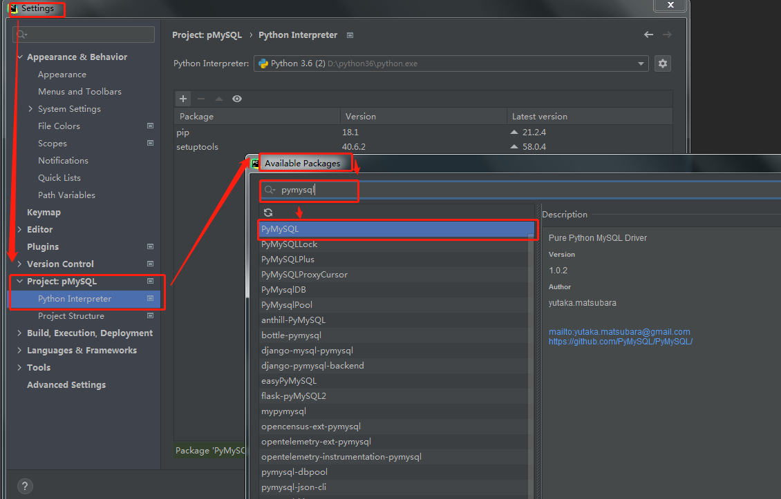 2.下载模块 (1) pip3 install pymysql # 在cmd或者pycharm终端输入) (2) settings --> python interpreter --> +号再搜索 # pycharm界面操作