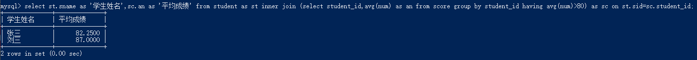 思路:这题需要两张表 1.先按学生序号分组求平均分,过滤出平均分大于80的学生 2.再将上述结果当作一张表和学生表连接成大表 3.在大表中查询学生姓名和平均成绩 select st.sname as '学生姓名',sc.an as '平均成绩' from student as st inner join ( select student_id,avg(num) as an from score group by student_id having avg(num)>80 ) as sc on st.sid=sc.student_id;