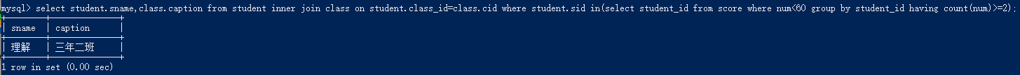 思路:这题需要三张表 1.先在分数表筛选出分数小于60分的记录 2.再按学生序号分组求挂科数,过滤挂科超两门的记录 3.按上述获取的学生序号在学生表查询姓名 4.通过学生表的班级序号连接班级表查询班级名称 select student.sname,class.caption from student