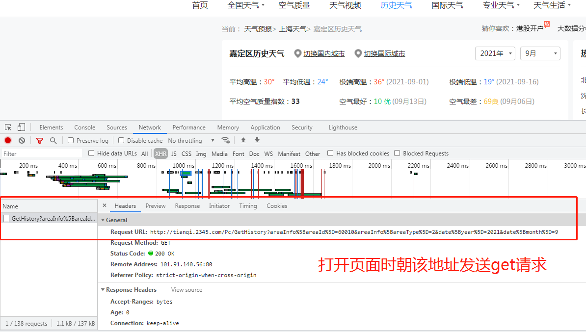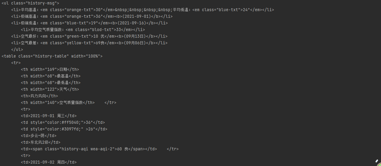 思路: 1.打开页面,先分析从数据加载的方式(空白处右键查看网页源代码) 2.源代码中并无天气数据,此页面为间接加载 3.查看打开该网页时会向哪些网址发送请求(空白处右键检查选network,get请求可直接将地址复制到浏览器地址栏访问) 4.分析请求得到的结果是否是天气数据 # 解析json字符串的网站:https://www.bejson.com/ 5.如果是就利用requests模块朝该地址发送get请求获取json数据 6.分析历史天气url的规律,可爬取其他月份的数据 import requests urlW = 'http://tianqi.2345.com/Pc/GetHistory?areaInfo%5BareaId%5D=60010&areaInfo%5BareaType%5D=2&date%5Byear%5D=2021&date%5Bmonth%5D=9' res = requests.get(urlW) dictW = res.json().get('data') print(dictW)