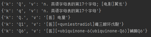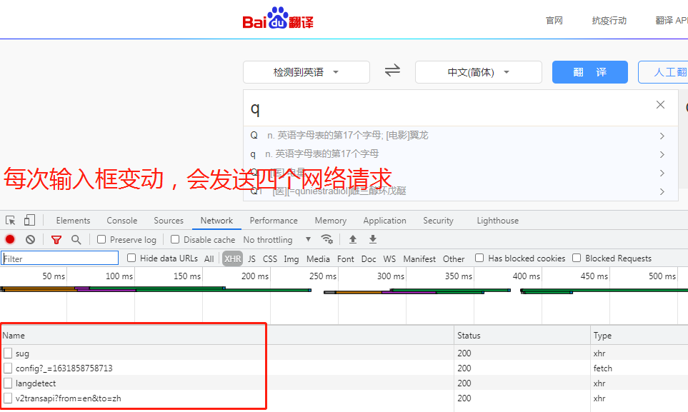 思路: 1.打开页面,先分析从数据加载的方式(空白处右键查看网页源代码) 2.源代码中并无输入单词的信息,此页面为间接加载 3.该网页对单词的翻译是随着输入框变动动态获取的 4.打开network,发现每次输入单词都会朝四个地址发送请求,其中sug频率固定 # 解析json字符串的网站:https://www.bejson.com/ 5.利用requests模块朝sug请求的地址发送post请求获取json数据 该请求用于显示输入框下拉菜单的数据 import requests urlEng = 'https://fanyi.baidu.com/sug' # 搜索框下拉数据 resE = requests.post(urlEng, headers={ 'User-Agent': 'Mozilla/5.0 (Windows NT 6.1; Win64; x64) AppleWebKit/537.36 (KHTML, like Gecko) Chrome/91.0.4472.114 Safari/537.36X-Requested-With: XMLHttpRequest'}, data={ 'kw': 'q' }) dataE = resE.json().get('data') for d in dataE: print(d)