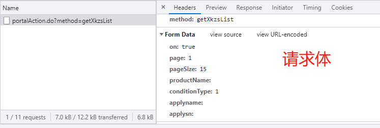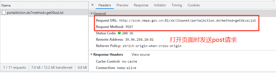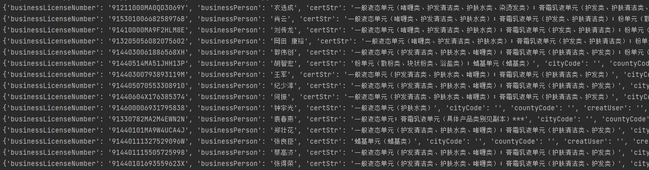 http://scxk.nmpa.gov.cn:81/xk/ 思路: 1.打开页面,先分析从数据加载的方式(空白处右键查看网页源代码) 2.源代码中并无药企信息,此页面为间接加载 3.查看打开该网页时会向哪些网址发送请求 4.发现打开页面时会向一个地址发送post请求,查看其请求体 5.利用requests模块朝sug请求的地址发送post请求获取json数据 6.继续验证详情页的数据加载方式 # 1.引入requests模块用于发送网络请求 import requests # 2.指定查找药企概要信息的url urlXkzsList = 'http://scxk.nmpa.gov.cn:81/xk/itownet/portalAction.do?method=getXkzsList' # 3.指定查找详情的url urlXkzsDetail = 'http://scxk.nmpa.gov.cn:81/xk/itownet/portalAction.do?method=getXkzsById' # 4.将请求体信息放入post请求并向概要url发送 res = requests.post(urlXkzsList, data={ 'on': 'true', 'page': 1, # 页码 'pageSize': 15, # 每页数据行数 'productName': '', 'conditionType': 1, 'applyname': '', 'applysn': '' }) # 5.获取上述的响应,为单页药企概要信息 dataList = res.json().get('list') # 6.循环获取每家药企的信息 for d in dataList: # 7.向每家药企发送携带企业ID的post请求 resD = requests.post(urlXkzsDetail, data={'id': d.get('ID')}) # 8.将请求结果(单家药企信息)反序列化成字典 resDict = resD.json() # 9.输出该企业信息 print(resDict)