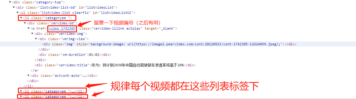 2、然后回到刚刚的页面,在空白处右键点击检查,选择Elements栏,再点击最右边的箭头符号,把鼠标移到视频部分,下边会定位到其所在的标签,寻找规律,发现这些标签都是在一个个<li class="categoryem">标签下
