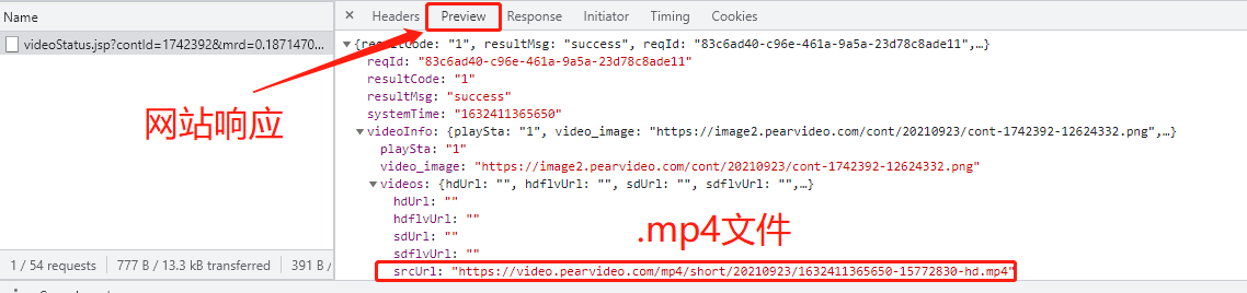 5、上图url中问号后的是get请求的参数,先选择Preview栏,可以看到返回信息中有个地址是.mp4,可以认为这就是视频数据的来源