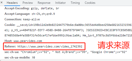 7、按照视频或者图片网站会采取的常规措施,应该是防盗链技术,看一下请求头,验证了我的猜想,这里的refer的值表示网络请求的来源,通俗地讲就是验证是否从网页点击打开视频的,不是的就拒绝访问
