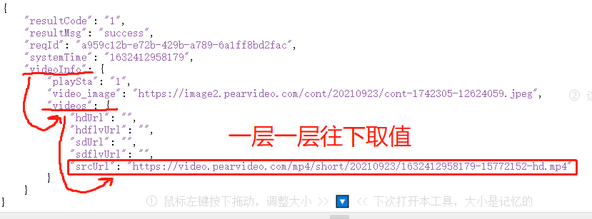 可以看到,视频地址是在videoInfo中的videos中的srcUrl的值