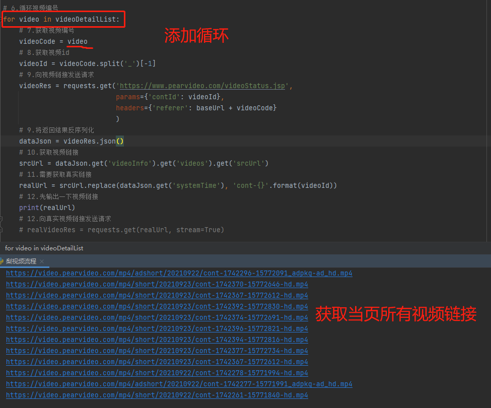 2、我们可以在获取单个视频数据的代码段外套一层循环并将视频编号改成随着列表获取