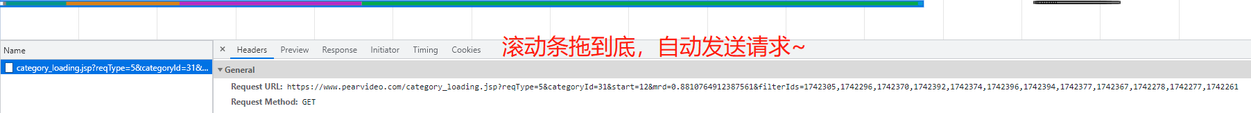 3、果然,又发送了一个请求,可以看到前三个是“最热”分类的视频,置顶;而后面十二个是在滚动条底部位置更新的视频