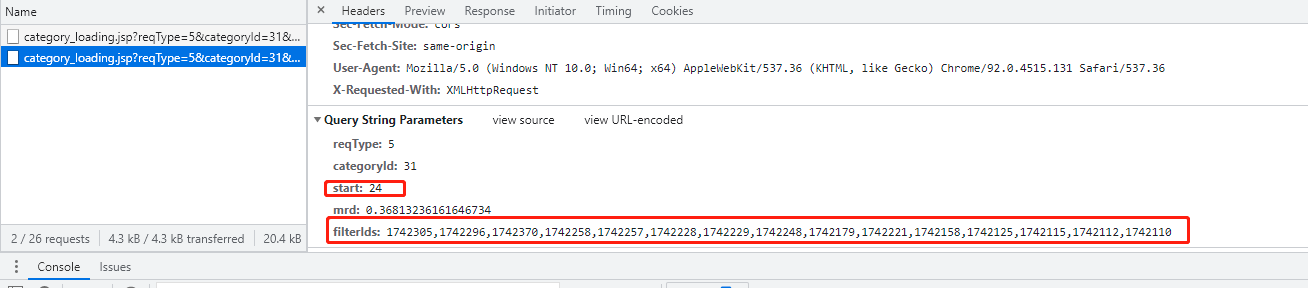 2、再来看一下这个请求的参数,可以看到12个视频id以及页面的起始位置,不妨大胆的猜测一下,再往下拖滚动条会引起参数的变化