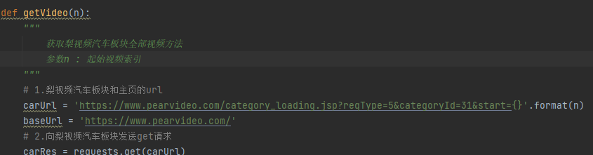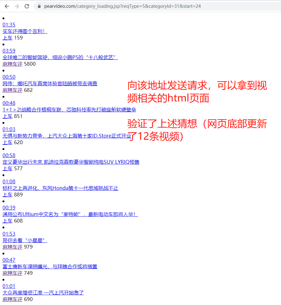 # 首先用上述请求地址替代之前汽车板块首页,起始位置自定义参数 carUrl = 'https://www.pearvideo.com/category_loading.jsp?reqType=5&categoryId=31&start={}'.format(n)