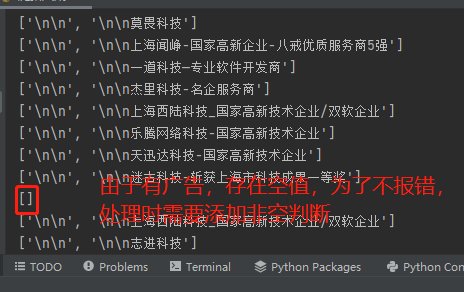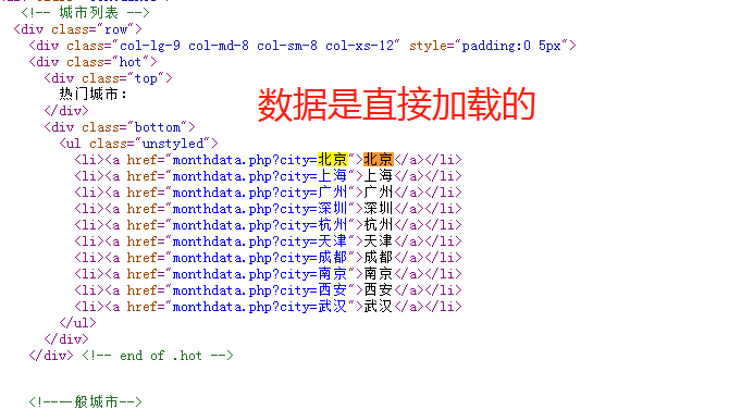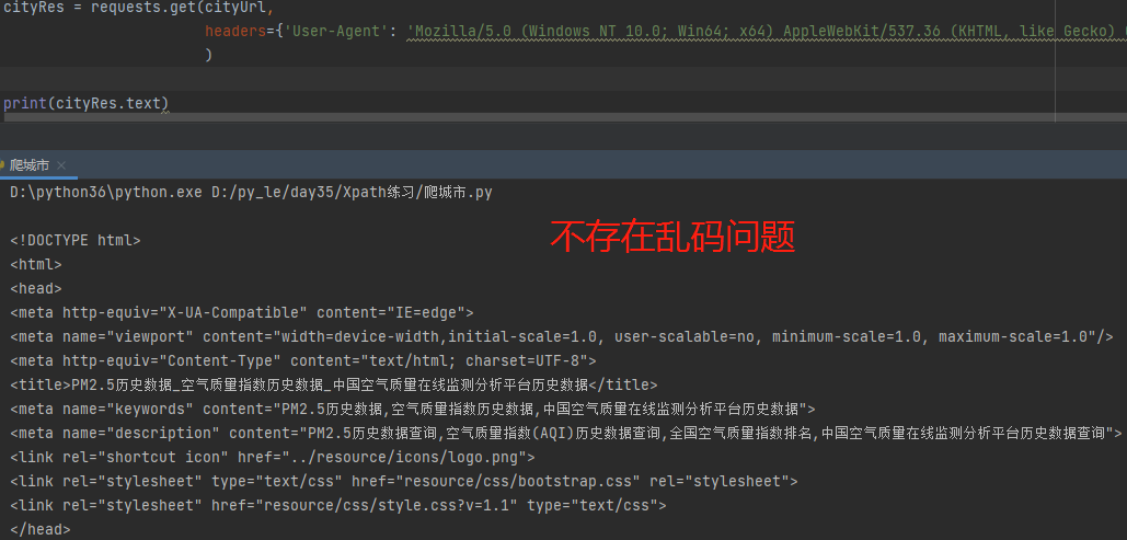 import requests from lxml import etree # 1.基础链接 cityUrl = 'https://www.aqistudy.cn/historydata/' # 2.发送请求 cityRes = requests.get(cityUrl, headers={'User-Agent': 'Mozilla/5.0 (Windows NT 10.0; Win64; x64) AppleWebKit/537.36 (KHTML, like Gecko) Chrome/93.0.4577.82 Safari/537.36'} ) # 3.生成xpath对象 cityHtml = etree.HTML(cityRes.text) # 4.获取热门城市名称列表 hotCityList = cityHtml.xpath('//div[@class="hot"]/div[2]/ul/li/a/text()') # print(hotCityList) # 5.获取全部城市名称列表 allCityList = cityHtml.xpath('//div[@class="all"]/div[2]/ul/div[2]/li/a/text()') # print(allCityList) # 6.获取该页面全部城市名称 allCityNames = cityHtml.xpath('//div[@class="hot"]/div[2]/ul/li/a/text() | //div[@class="all"]/div[2]/ul/div[2]/li/a/text()') print(allCityNames)