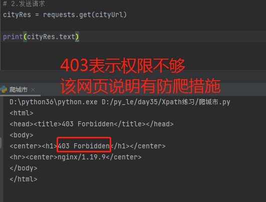 2、向该页面发送get请求,收到状态码为403的响应,说明该网站有防爬措施。