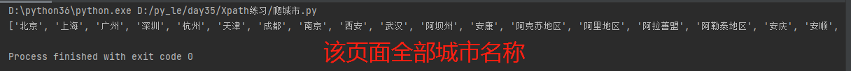 6、如果想要获取页面所有城市名称,即同时获取多个标签位置的数据,可以在xpath的参数中写入多条标签路径并用 | 分割。