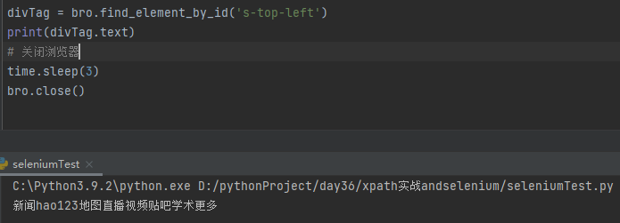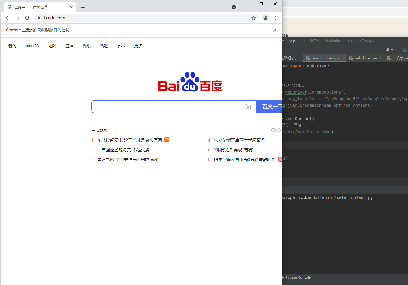 from selenium import webdriver import time # 1.指定操作的浏览器驱动(简单粗暴版,不推荐) # 如果找不到,可以手动配置浏览器绝对路径 # options = webdriver.ChromeOptions() # options.binary_location = "C:\Program Files\Google\Chrome\Application\chrome.exe" # bro = webdriver.Chrome(chrome_options=options) # 1.指定操作的浏览器驱动 bro = webdriver.Chrome() # 2.控制浏览器访问网站 bro.get('https://www.baidu.com') # 关闭浏览器 time.sleep(3) bro.close()